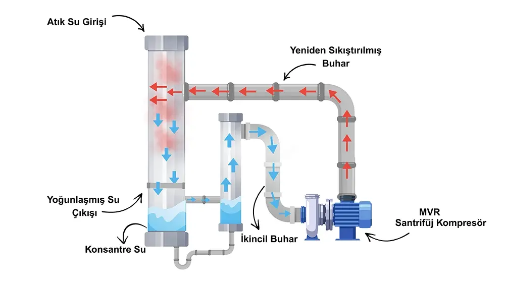 Sıkıştırılmış buhar, yeni atık suyu ısıtmak için tekrar sisteme verilir. Bu döngü, sistemin enerji tüketimini ciddi oranda düşürür.